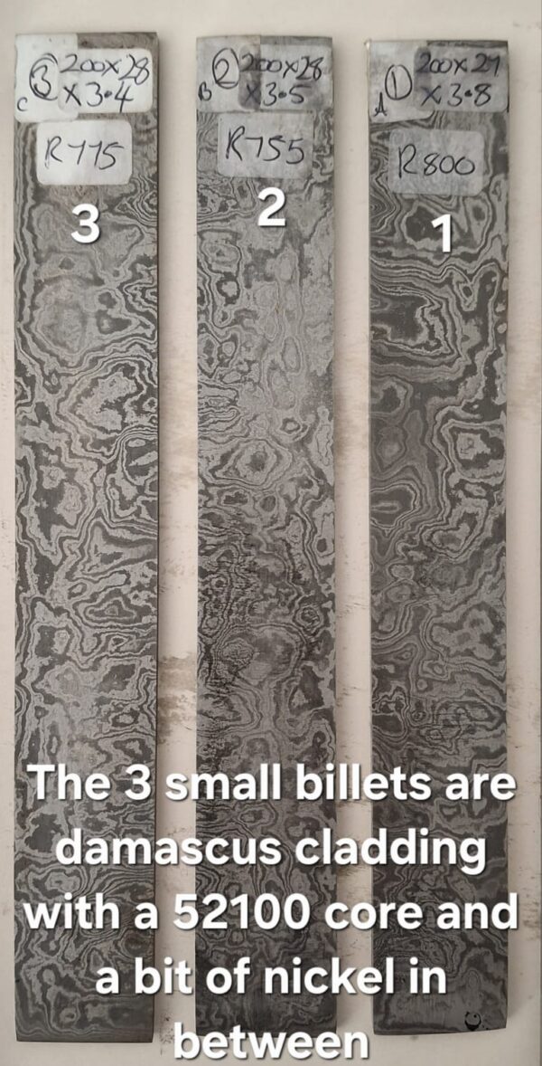 The 3 smaller billets: Damascus cladding with a 52100 core and Nickel in between.