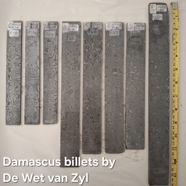 Various patterns of DAMASCUS / San-Mai Billets available on request, for that one of a kind, special art knife you are planning. Quality South African produced Damascus strips of different patterns and sizes to suit all tastes.