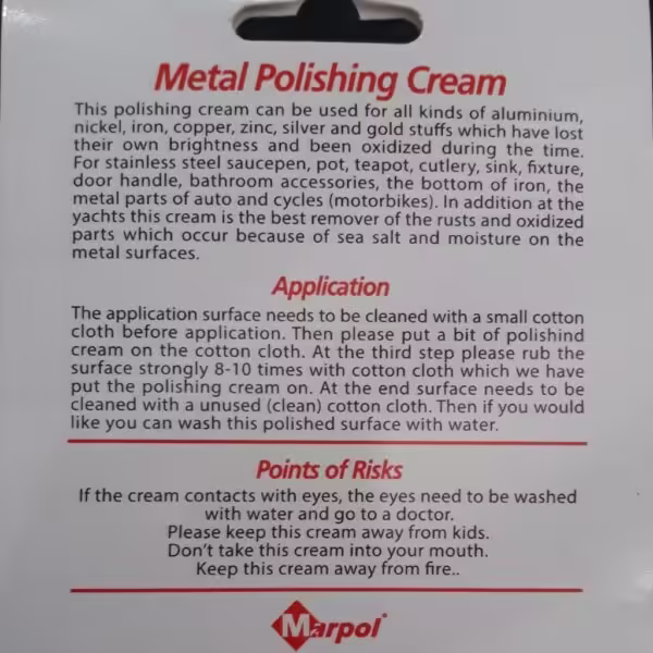 Marpol Polishing Cream is ideal for hand polishing of metal items to a high gloss finish.